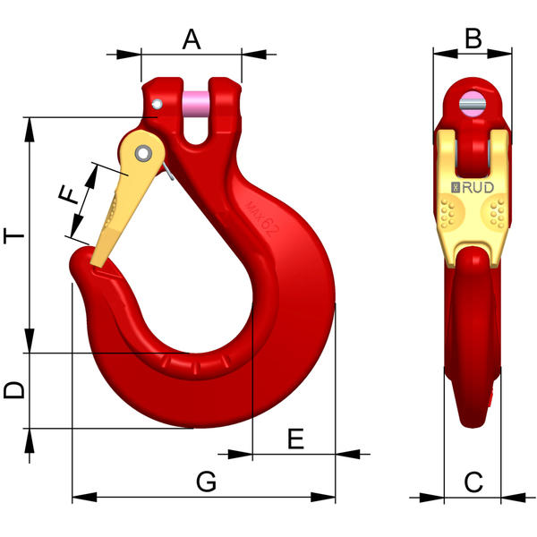 Supplied complete with a safety latch that locks into the hook tip. Therefore protected against lateral bending. Three-turned double leg corrosion protected spring. Wear edges on both sides. Marking for wear of the throat width and the bowl of the hook.