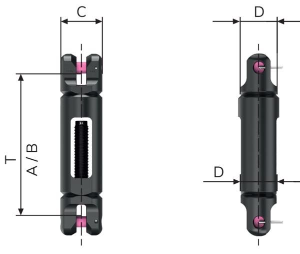 Length adjustment for VIP-chain. For an exact length adjustment on a chain sling. Deu to running on the ratchet, adjustment to the mm can be performed. Under load, it is only possible to elongate the chain strand. Shortening with claw VV. Clevis connection on both sides. Retaining and load pins are preassembled.